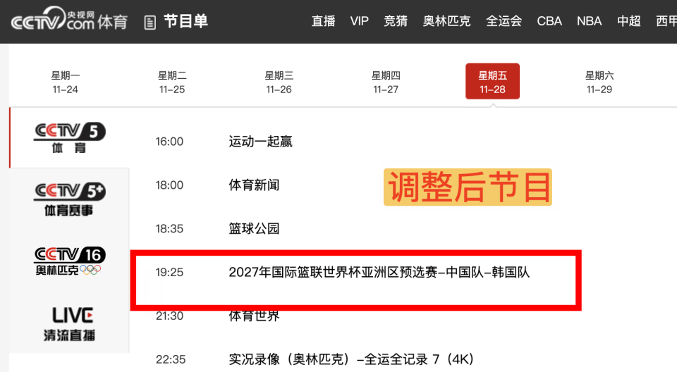 雨燕直播,NBA直播,世界杯直播,足球直播,台球直播,体育直播,世界杯,欧洲杯,苏超直播,村BA直播,苏超联赛,村超,村超直播北京时间11月28日,2027年国际篮联篮球世界杯亚洲区预选赛将在北京五棵松体育馆正式拉开帷幕,中国男篮将在首个窗口期坐镇主场迎战老对手韩国男篮。对于这场备受瞩目的中韩对决,中央电视台体育频道的转播安排经历了一番令人玩味的波折。相信不少细心的球迷此前已经查看过小编发布的央视节目预告表,在最初的直播计划中,CCTV5在该时段安排的是《全运全记录》而非本场比赛的直播。然而就在大战一触即发的最后时刻,央视体育频道最终对节目编排进行了紧急且重大的临时调整,原定的录播节目被推迟到了22:35分。这一突如其来的改动,无疑从侧面印证了本场比赛在国家级媒体眼中的分量,也让原本担心无法通过电视大屏收看比赛的球迷们松了一口气。